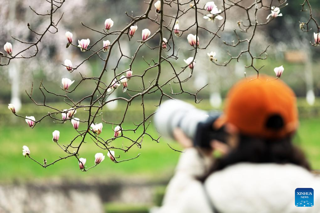 BEIJING, 27 febrero, 2026 (Xinhua) -- Imagen del 25 de febrero de 2026 de un turista tomando fotografías de flores de magnolia en el área escénica de Yuhuatai, en Nanjing, en la provincia de Jiangsu, en el este de China. (Xinhua/Sun Zhongnan)