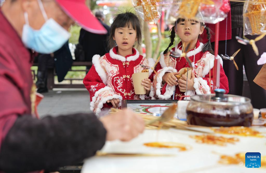 CHENGDU, 27 febrero, 2026 (Xinhua) -- Niños observan a un artesano del arte del sirope trabajando en una feria del templo en el Templo de Wuhou, en Chengdu, en la provincia de Sichuan, en el suroeste de China, el 27 de febrero de 2026. La feria del templo se lleva a cabo aquí para conmemorar la Fiesta de la Primavera, o Año Nuevo chino, en curso, que finalizará el día 15 del primer mes lunar. (Xinhua/Liu Kun)