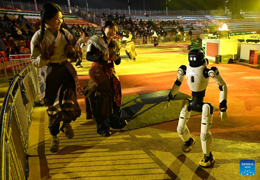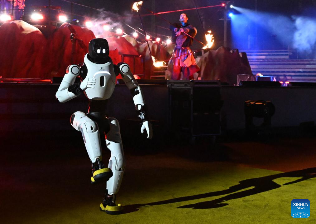 QINGDAO, 27 febrero, 2026 (Xinhua) -- Imagen del 26 de febrero de 2026 de un robot humanoide presentándose durante un espectáculo de acción en vivo con temática mítica en un área escénica, en Qingdao, en la provincia de Shandong, en el este de China. (Xinhua/Li Ziheng)