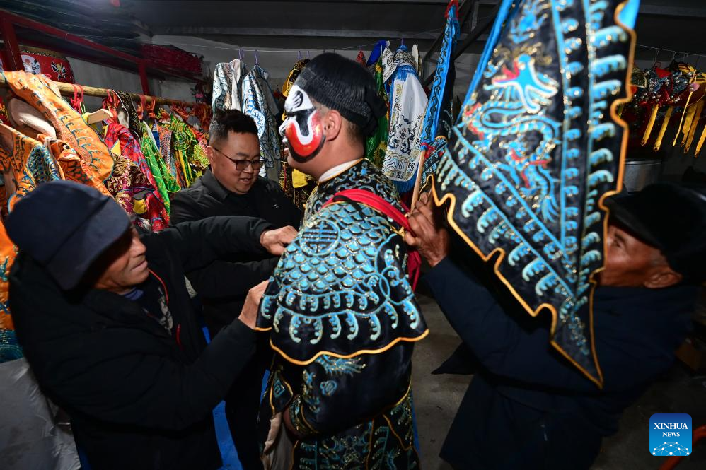 BAOJI, 2 marzo, 2026 (Xinhua) -- Aldeanos ayudan a un miembro del equipo del desfile Shehuo, a ponerse los trajes para su presentación, en la aldea Huanghuayu, en el distrito de Longxian de la ciudad de Baoji, en la provincia de Shaanxi, en el noroeste de China, en las primeras horas del 2 de marzo de 2026. Shehuo es una forma de arte folclórico tradicional chino. El distrito de Longxian celebró un desfile local especial de Shehuo el lunes, con artistas a caballo ataviados con un maquillaje facial sencillo pero exquisito. (Xinhua/Zou Jingyi)