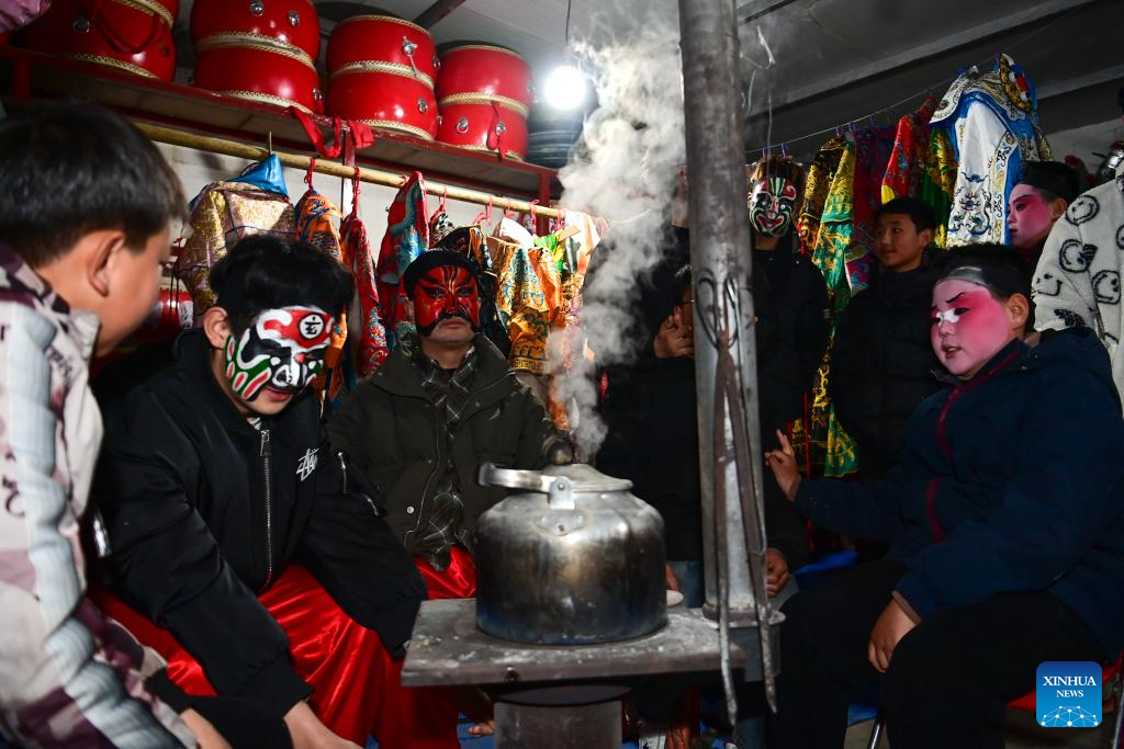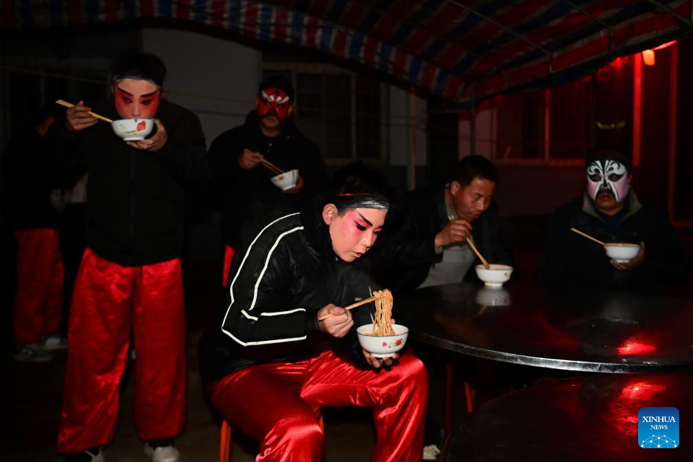 BAOJI, 2 marzo, 2026 (Xinhua) -- Miembros de un equipo de desfile Shehuo desayunan, en la aldea Huanghuayu, en el distrito de Longxian de la ciudad de Baoji, en la provincia de Shaanxi, en el noroeste de China, en las primeras horas del 2 de marzo de 2026. Shehuo es una forma de arte folclórico tradicional chino. El distrito de Longxian celebró un desfile local especial de Shehuo el lunes, con artistas a caballo ataviados con un maquillaje facial sencillo pero exquisito. (Xinhua/Zou Jingyi)