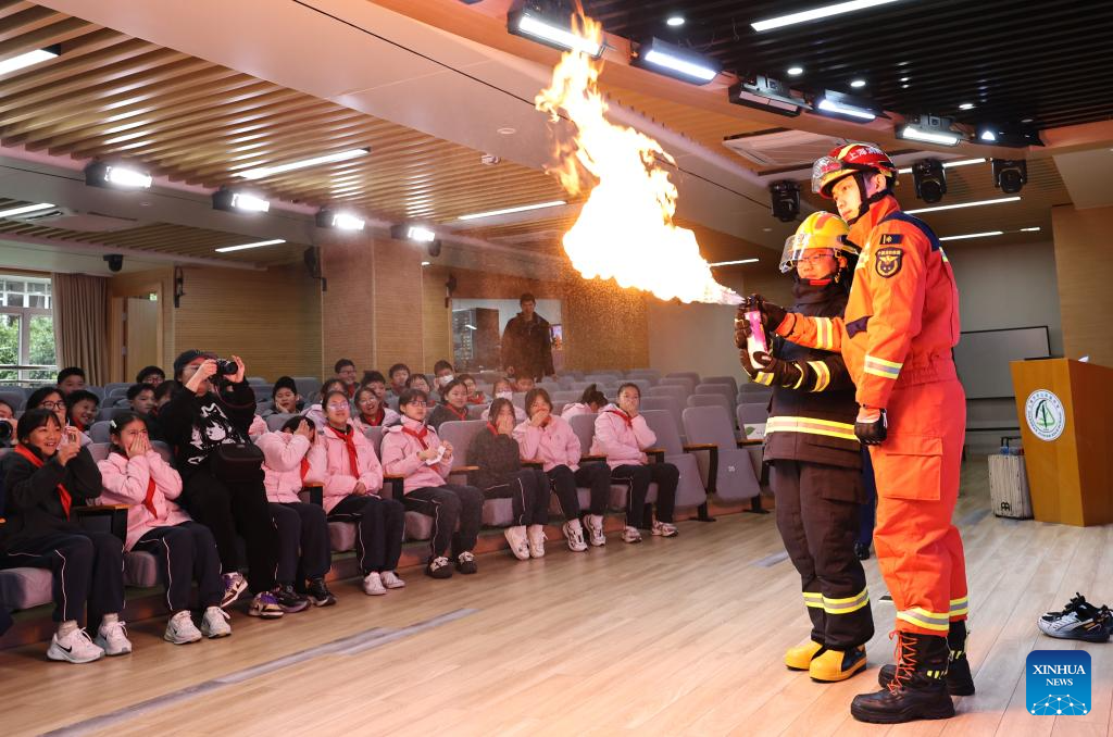 BEIJING, 2 marzo, 2026 (Xinhua) -- Bomberos ayudan a los estudiantes a comprender los peligros de los materiales inflamables durante una conferencia en una escuela secundaria, en el distrito de Changning de Shanghai, en el este de China, el 2 de marzo de 2026. Un nuevo semestre comenzó el lunes para las escuelas primarias y secundarias, así como para los jardines de niños en muchas partes de China. (Xinhua/Fang Zhe)