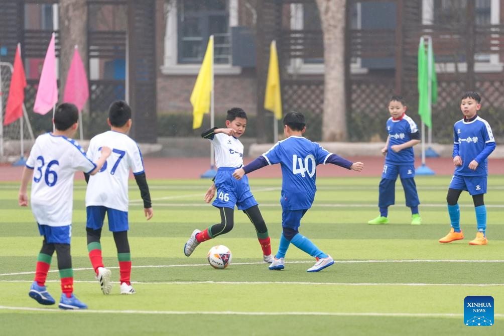 BEIJING, 2 marzo, 2026 (Xinhua) -- Estudiantes compiten durante un partido de fútbol en una escuela primaria, en Beijing, capital de China, el 2 de marzo de 2026. Un nuevo semestre comenzó el lunes para las escuelas primarias y secundarias, así como para los jardines de niños en muchas partes de China. (Xinhua/Xie Han)