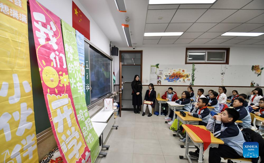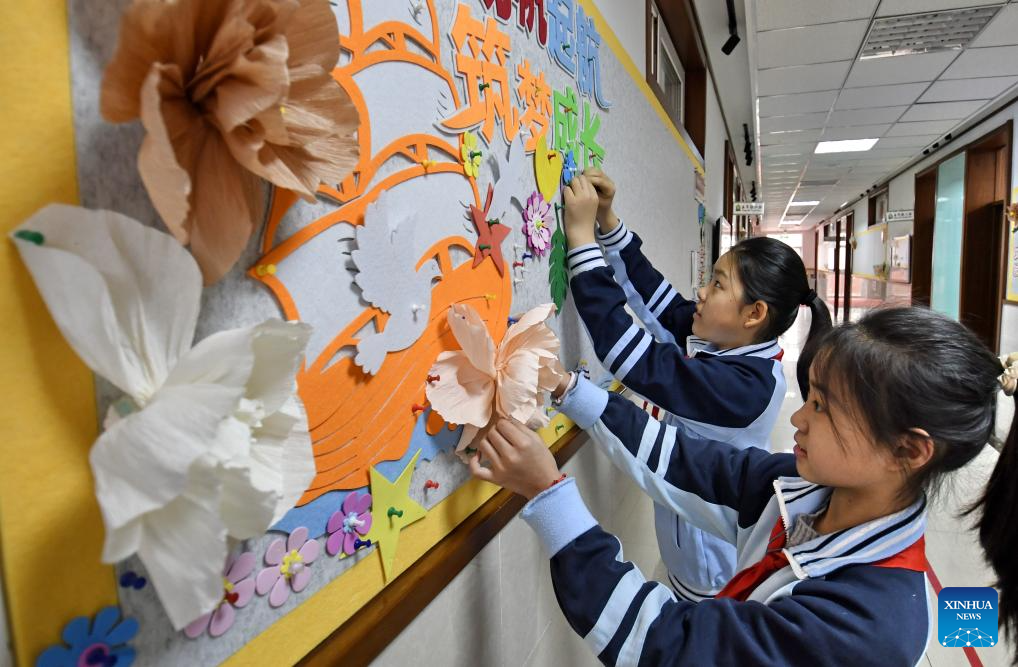 BEIJING, 2 marzo, 2026 (Xinhua) -- Estudiantes decoran un tablero de exhibición en una escuela primaria, en el distrito de Dongcheng de Beijing, capital de China, el 2 de marzo de 2026. Un nuevo semestre comenzó el lunes para las escuelas primarias y secundarias en muchas partes de China. (Xinhua/Li Xin)