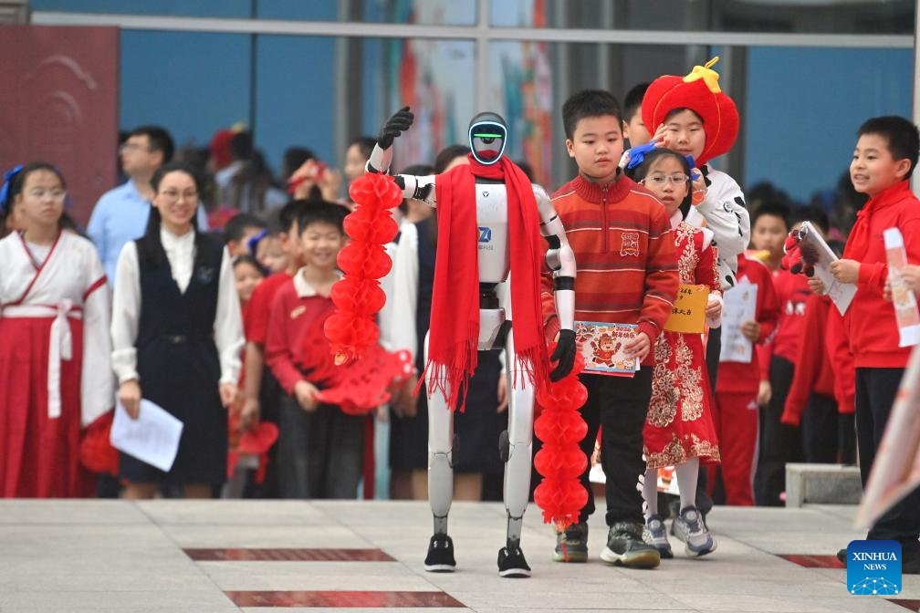 BEIJING, 2 marzo, 2026 (Xinhua) -- Estudiantes, junto con un robot humanoide, ofrecen saludos del Año Nuevo chino en la ceremonia de apertura del nuevo semestre en una escuela primaria, en Nanning, en la región autónoma de la etnia zhuang de Guangxi, en el sur de China, el 2 de marzo de 2026. Un nuevo semestre comenzó el lunes para las escuelas primarias y secundarias, así como para los jardines de niños en muchas partes de China. (Xinhua/Huang Xiaobang)