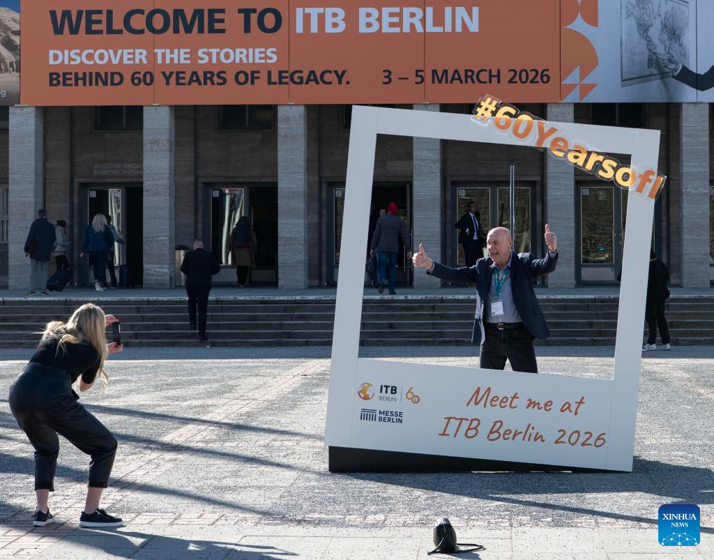 BERLIN, 3 marzo, 2026 (Xinhua) -- Un hombre posa para fotografías afuera de la sede de la feria de viajes ITB Berlín, en Berlín, Alemania, el 3 de marzo de 2026. La feria de viajes ITB Berlín de este año comenzó aquí el martes y durará hasta el 5 de marzo. Llevada a cabo por primera vez en 1966, el evento celebra este año su 60 aniversario. (Xinhua/Zhang Haofu)