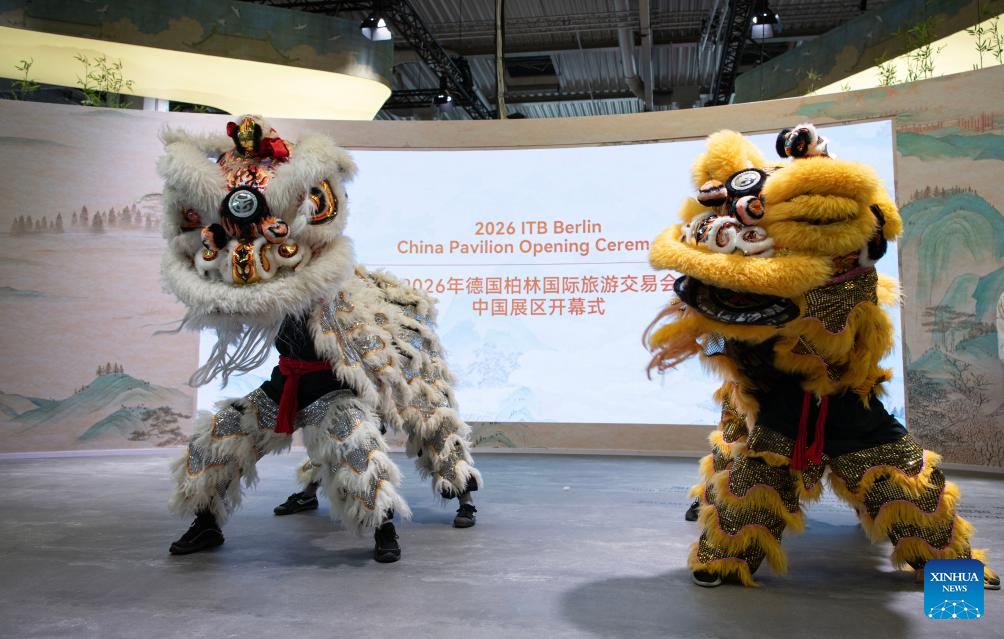BERLIN, 3 marzo, 2026 (Xinhua) -- Artistas presentan la danza del león durante la Ceremonia de Inauguración del Pabellón de China en la feria de viajes ITB Berlín, en Berlín, Alemania, el 3 de marzo de 2026. La feria de viajes ITB Berlín de este año comenzó aquí el martes y durará hasta el 5 de marzo. Llevada a cabo por primera vez en 1966, el evento celebra este año su 60 aniversario. (Xinhua/Zhang Haofu)