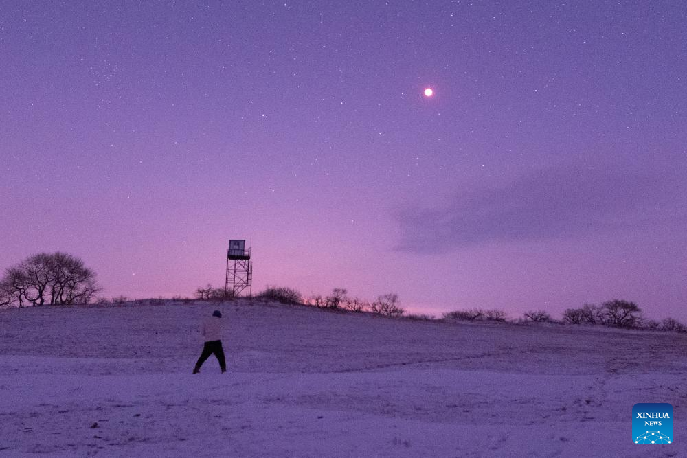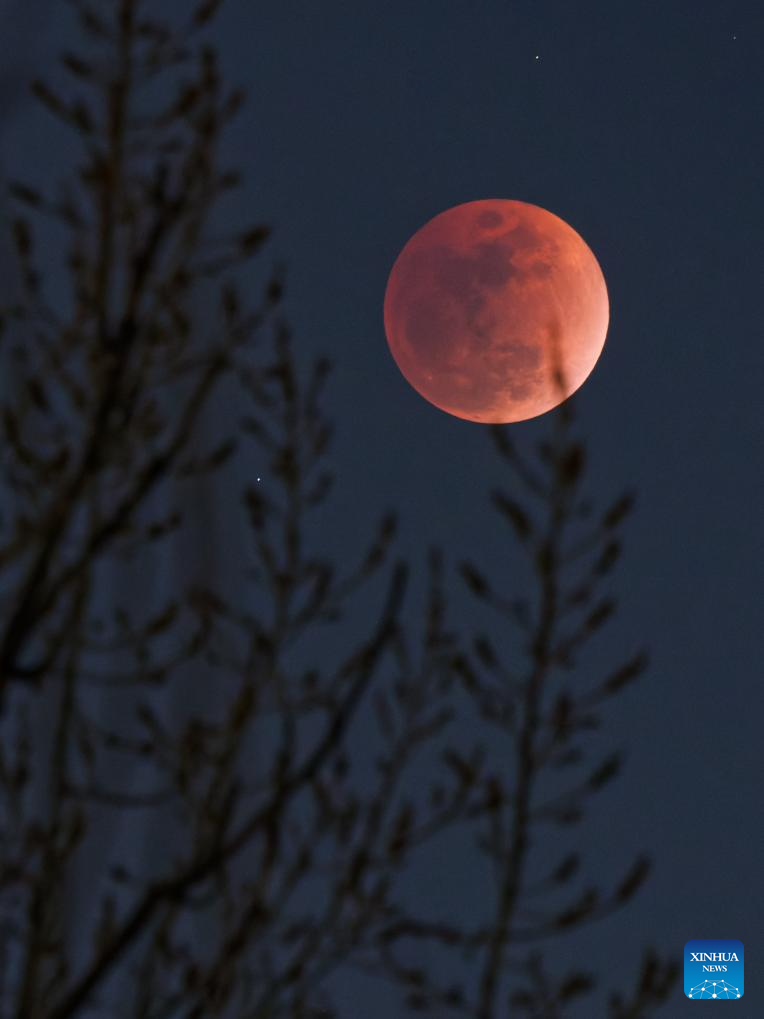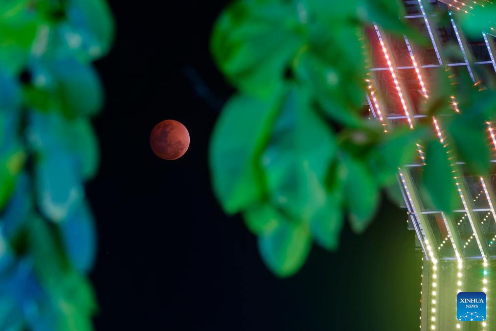 BEIJING, 3 marzo, 2026 (Xinhua) -- La luna es vista durante un eclipse lunar total sobre la ciudad de Qiqihar, en la provincia de Heilongjiang, en el noreste de China, el 3 de marzo de 2026. El martes se celebró el Festival de las Linternas, que tiene lugar el decimoquinto día del primer mes del calendario tradicional chino. El festival de este año coincidió con un eclipse lunar total. (Xinhua/Wang Yonggang)