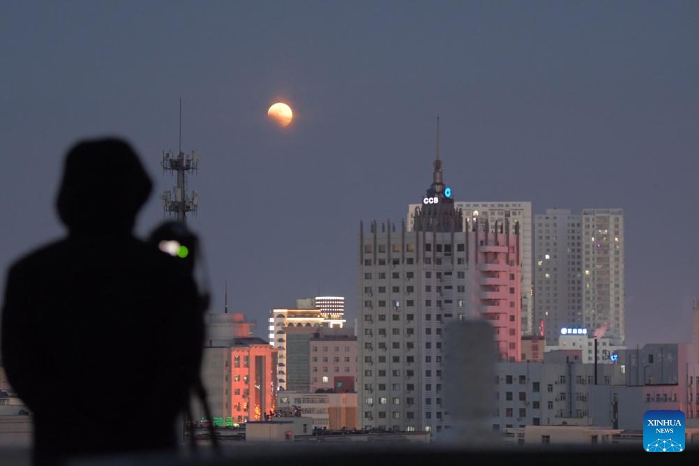BEIJING, 3 marzo, 2026 (Xinhua) -- Un ciudadano fotografía un eclipse lunar total sobre la ciudad de Qiqihar, en la provincia de Heilongjiang, en el noreste de China, el 3 de marzo de 2026. El martes se celebró el Festival de las Linternas, que tiene lugar el decimoquinto día del primer mes del calendario tradicional chino. El festival de este año coincidió con un eclipse lunar total. (Xinhua/Wang Yonggang)