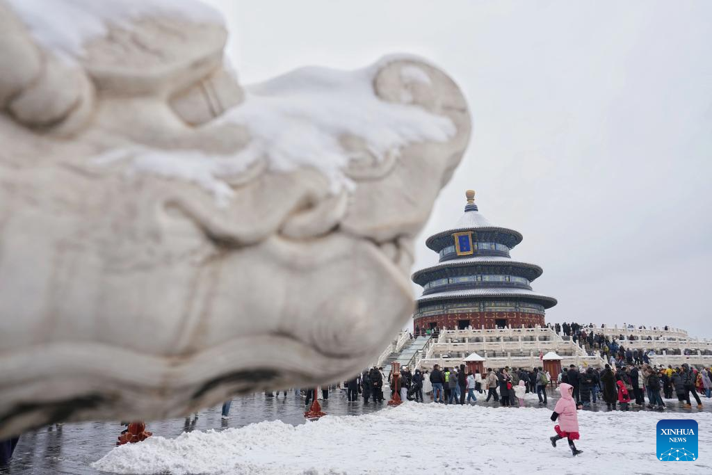 BEIJING, 5 marzo, 2026 (Xinhua) -- Turistas visitan el parque Tiantan (Templo del Cielo), en Beijing, capital de China, el 5 de marzo de 2026. Beijing fue testigo de una nevada primaveral del miércoles al jueves. (Xinhua/Ju Huanzong)