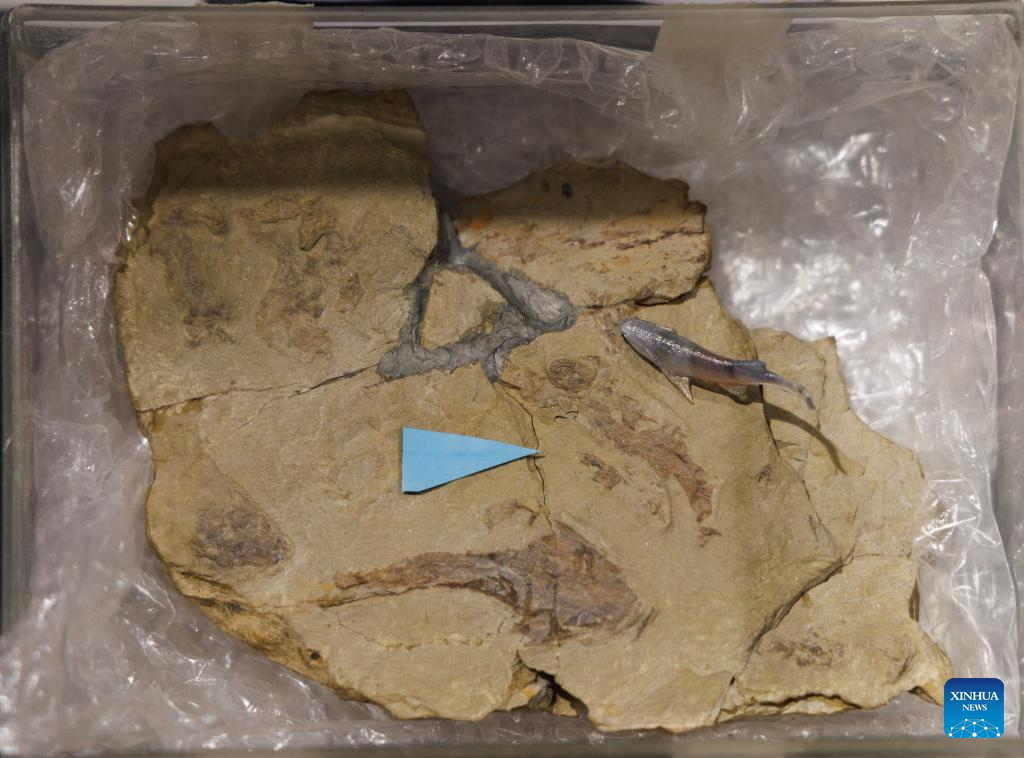 BEIJING, 5 marzo, 2026 (Xinhua) -- Imagen del 3 de marzo de 2026 del fósil de Eosteus chongqingensis en el Instituto de Paleontología y Paleoantropología de Vertebrados de la Academia de Ciencias de China, en Beijing, capital de China. Los fósiles de dos peces de hace más de 400 millones de años, uno era una diminuta criatura aerodinámica y el otro un gigante entre los vertebrados de su tiempo con dientes extraños, han sido descubiertos en China, llenando un vacío crucial en el proceso evolutivo "de pez a humano". (Xinhua/Jin Liwang)