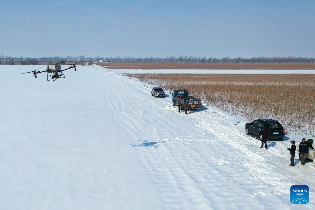 MANAS, 6 marzo, 2026 (Xinhua) -- Vista aérea tomada con un dron el 4 de marzo de 2026 de una persona volando un dron para rociar fertilizantes en los campos, en el poblado de Letuyi del distrito de Manas de la prefectura autónoma de la etnia hui de Changji, en la región autónoma uygur de Xinjiang, en el noroeste de China. Los fabricantes de suministros agrícolas de Xinjiang trabajan a plena capacidad para cumplir con los pedidos y garantizar un flujo constante de fertilizantes y materiales para la agricultura de primavera. (Xinhua/Ding Lei)