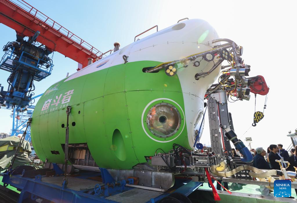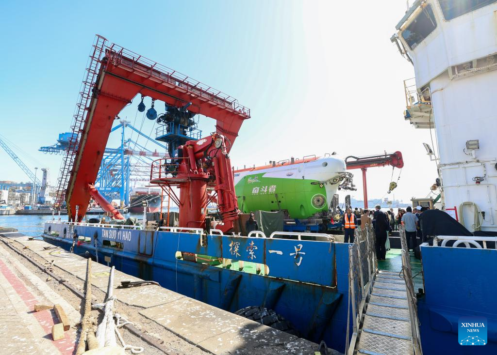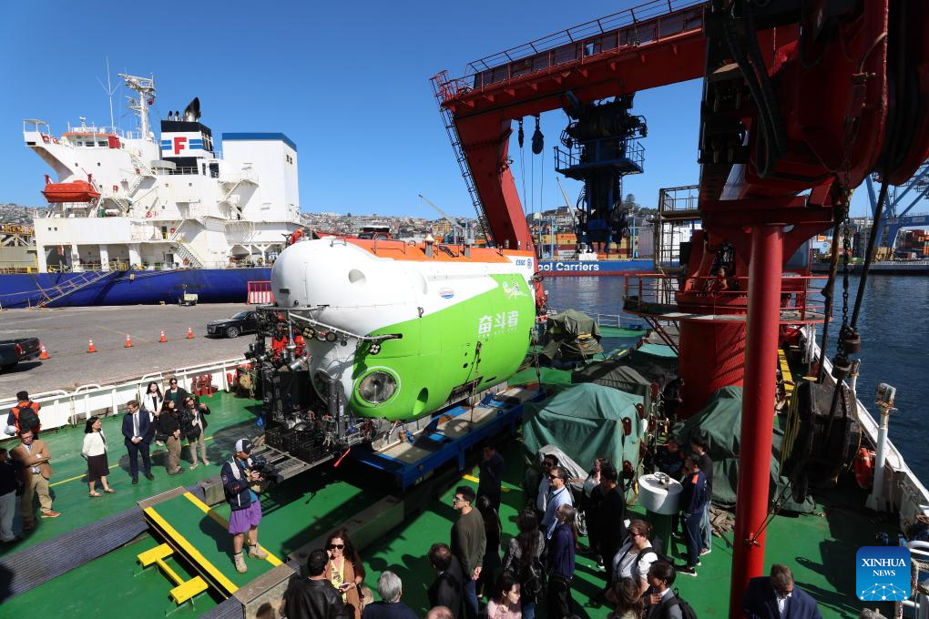 VALPARAISO, 7 marzo, 2026 (Xinhua) -- Imagen del 5 de marzo de 2026 del sumergible tripulado de aguas profundas Fendouzhe a bordo del buque de investigación Tansuo-1, en el Puerto de Valparaíso, Chile. La recepción de clausura de la Expedición Conjunta China-Chile a la Fosa de Atacama se llevó a cabo aquí el jueves. (Xinhua/Zhou Jiayi)