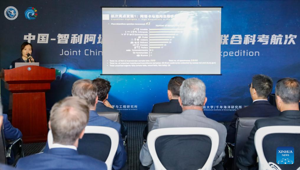 VALPARAISO, 7 marzo, 2026 (Xinhua) -- Imagen del 5 de marzo de 2026 de Du Mengran, co-jefa científica de la expedición de investigación conjunta, hablando durante la recepción de clausura de la Expedición Conjunta China-Chile a la Fosa de Atacama a bordo del buque de investigación Tansuo-1, en el Puerto de Valparaíso, Chile. La recepción de clausura de la Expedición Conjunta China-Chile a la Fosa de Atacama se llevó a cabo aquí el jueves. (Xinhua/Zhou Jiayi)