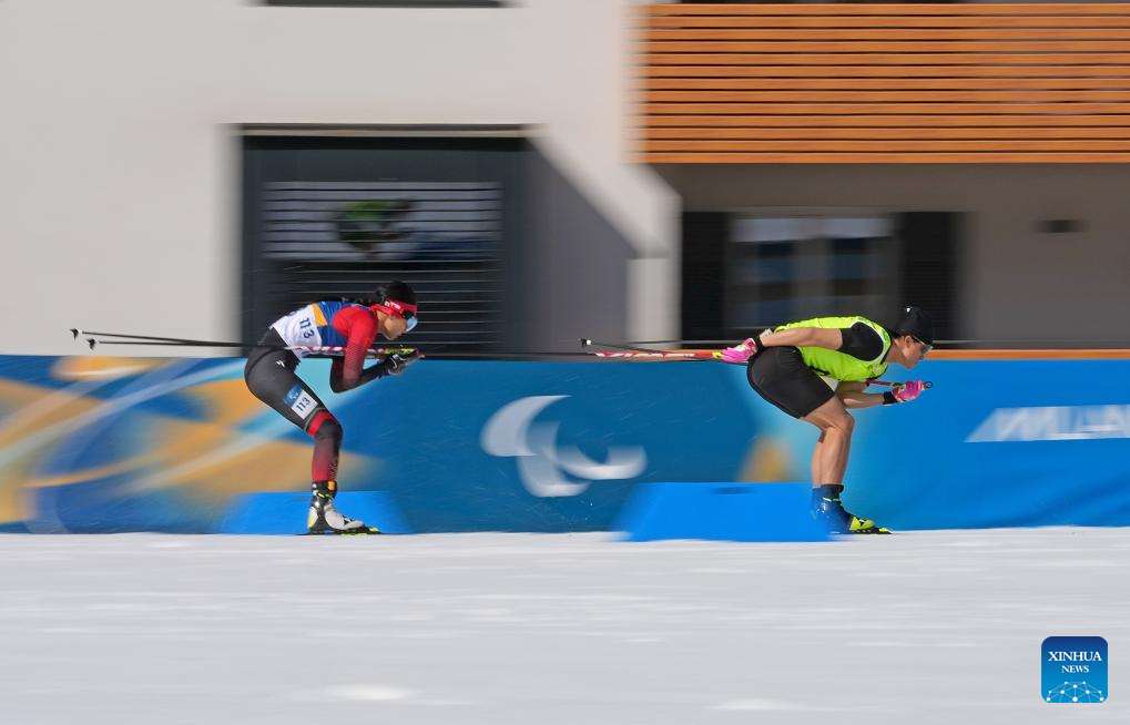 TESERO, 8 marzo, 2026 (Xinhua) -- Wang Yue (d) y su guía Chen Guoming, de China, compiten durante la final de individual femenino con discapacidad visual de para biatlón en los Juegos Paralímpicos de Invierno Milán-Cortina 2026, en Tesero, Italia, el 8 de marzo de 2026. (Xinhua/Hou Zhaokang)