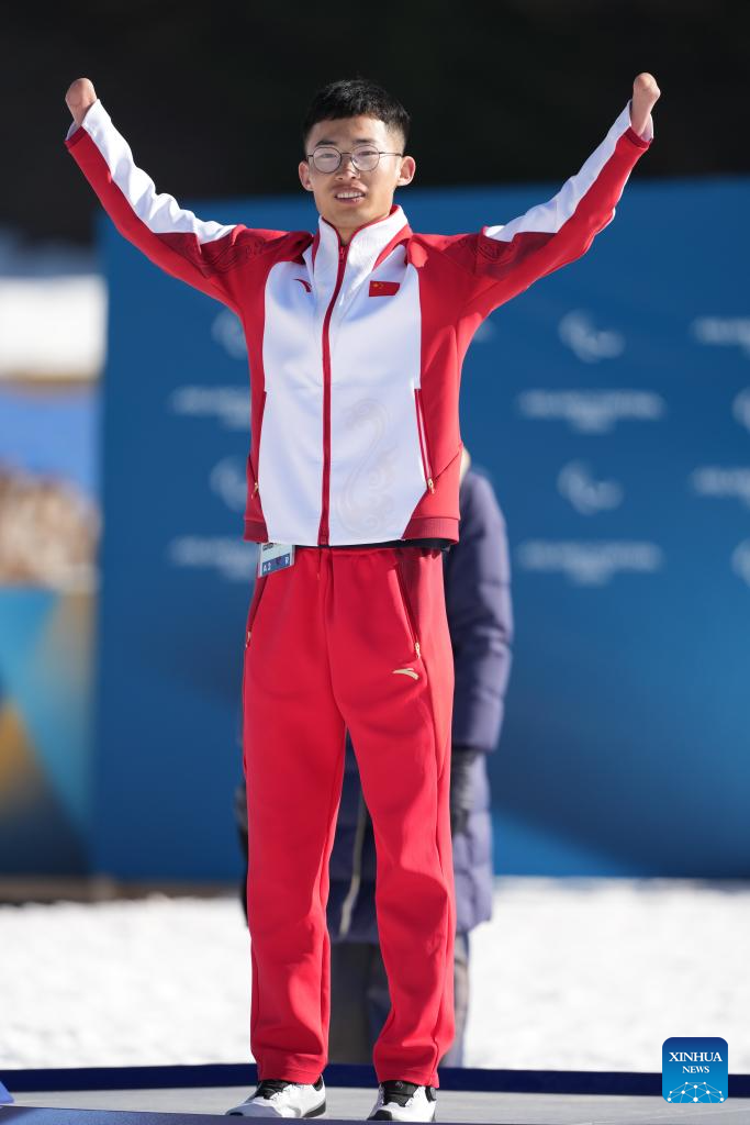 TESERO, 8 marzo, 2026 (Xinhua) -- Imagen del 7 de marzo de 2026 del medallista de plata, Liu Xiaobin, de China festejando en el podio durante la ceremonia de premiación del esprint masculino de para biatlón en los Juegos Paralímpicos de Invierno Milán-Cortina 2026, en Tesero, Italia. (Xinhua/Hou Zhaokang)