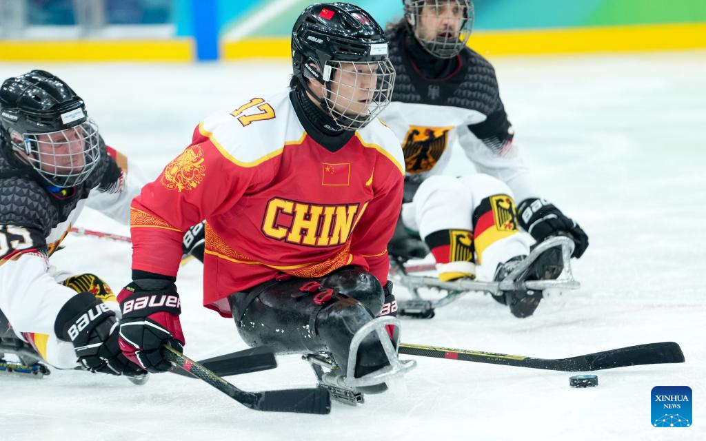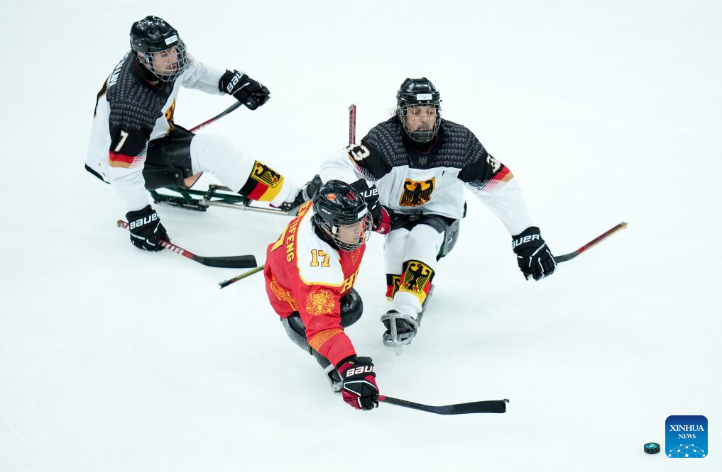 MILAN, 8 marzo, 2026 (Xinhua) -- Imagen del 7 de marzo de 2026 de Shen Yifeng (c), de China, disputando el disco con Ingo Kuhli-Lauenstein (d), y Leopold Reimann, de Alemania, durante el partido de la ronda preliminar de grupo A entre China y Alemania de para hockey sobre hielo en los Juegos Paralímpicos de Invierno Milán-Cortina 2026, en Milán, Italia. (Xinhua/Li Jing)