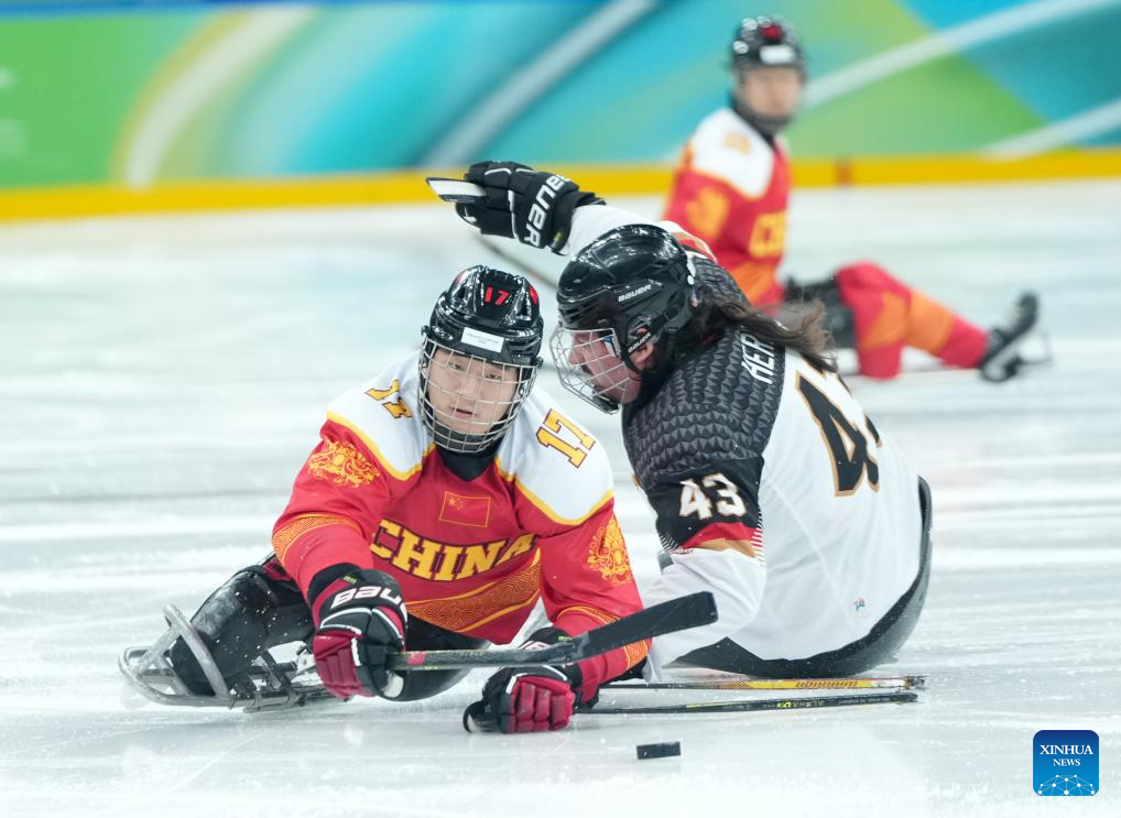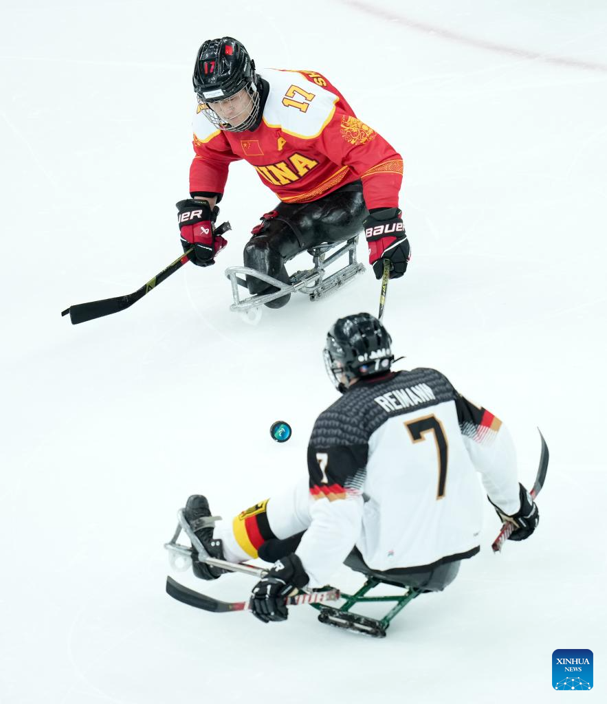 MILAN, 8 marzo, 2026 (Xinhua) -- Imagen del 7 de marzo de 2026 de Shen Yifeng (i), de China, disputando el disco con Bernhard Hering, de Alemania, durante el partido de la ronda preliminar de grupo A entre China y Alemania de para hockey sobre hielo en los Juegos Paralímpicos de Invierno Milán-Cortina 2026, en Milán, Italia. (Xinhua/Li Jing)