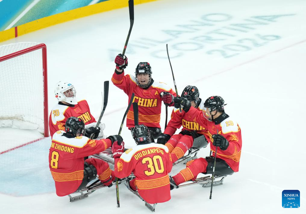 MILAN, 8 marzo, 2026 (Xinhua) -- Imagen del 7 de marzo de 2026 de jugadores de China animándose durante el partido de la ronda preliminar de grupo A entre China y Alemania de para hockey sobre hielo en los Juegos Paralímpicos de Invierno Milán-Cortina 2026, en Milán, Italia. (Xinhua/Li Jing)