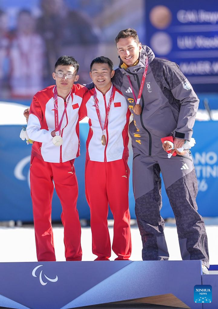 TESERO, 8 marzo, 2026 (Xinhua) -- Imagen del 7 de marzo de 2026 del medallista de oro, Cai Jiayun (i), de China, saludando al término de la ceremonia de premiación del esprint masculino de para biatlón en los Juegos Paralímpicos de Invierno Milán-Cortina 2026, en Tesero, Italia. (Xinhua/Hou Zhaokang)