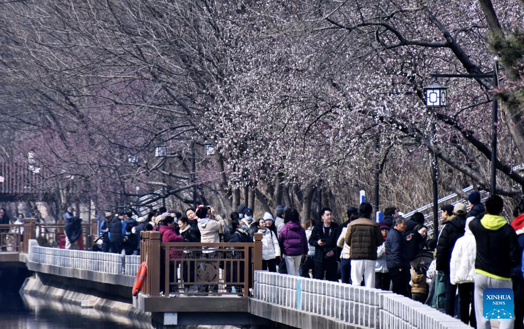 BEIJING, 8 marzo, 2026 (Xinhua) -- Personas observan flores de durazno, en el distrito de Chaoyang, en Beijing, capital de China, el 8 de marzo de 2026. (Xinhua/Li Xin)