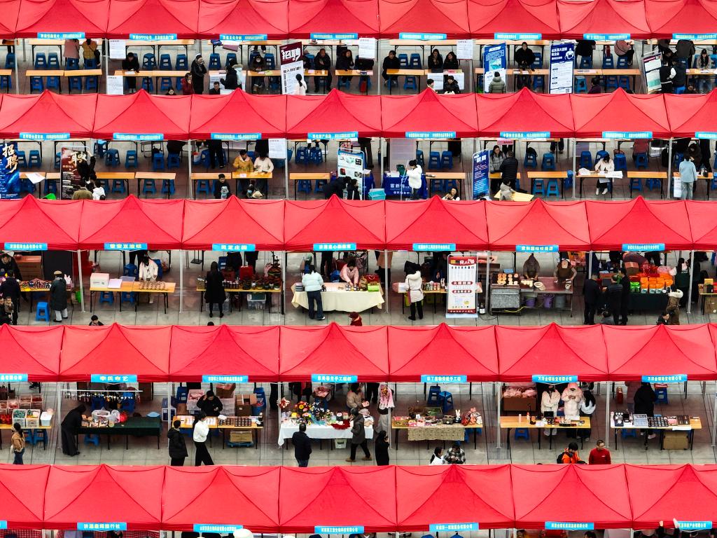 BEIJING, 8 marzo, 2026 (Xinhua) -- Vista aérea tomada con un dron el 8 de marzo de 2026 de una feria de empleo dedicada a la mujer, en la ciudad de Jiyuan, en la provincia de Henan, en el centro de China. Diversos eventos se llevaron a cabo en China el domingo para conmemorar el Día Internacional de la Mujer. (Xinhua/Miao Qiunao)