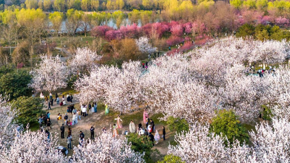 XI'AN, 9 marzo, 2026 (Xinhua) -- Vista aérea tomada con un dron de turistas disfrutando de su tiempo libre bajo árboles en flor en el Parque del Patrimonio Nacional del Palacio Daming, en Xi'an, en la provincia de Shaanxi, en el noroeste de China, el 9 de marzo de 2026. Las flores retoñan mientras la temperatura incrementa en China. (Xinhua/Zou Jingyi)