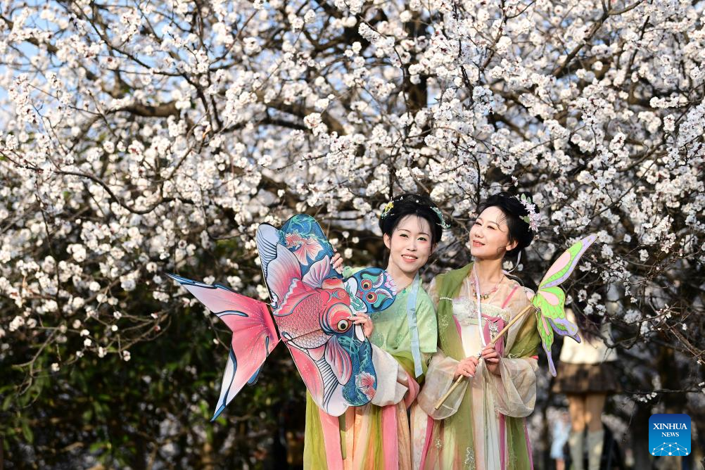 XI'AN, 9 marzo, 2026 (Xinhua) -- Turistas posan para fotografías con árboles en flor en el Parque del Patrimonio Nacional del Palacio Daming, en Xi'an, en la provincia de Shaanxi, en el noroeste de China, el 9 de marzo de 2026. Las flores retoñan mientras la temperatura incrementa en China. (Xinhua/Zou Jingyi)