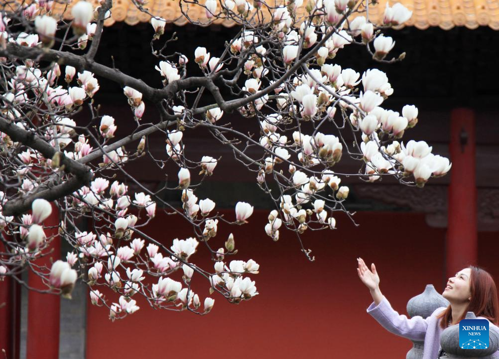BEIJING, 12 marzo, 2026 (Xinhua) -- Imagen del 8 de marzo de 2026 de una turista vista con flores de magnolia, en Nanjing, en la provincia de Jiangsu, en el este de China. (Xinhua/Liu Jianhua)