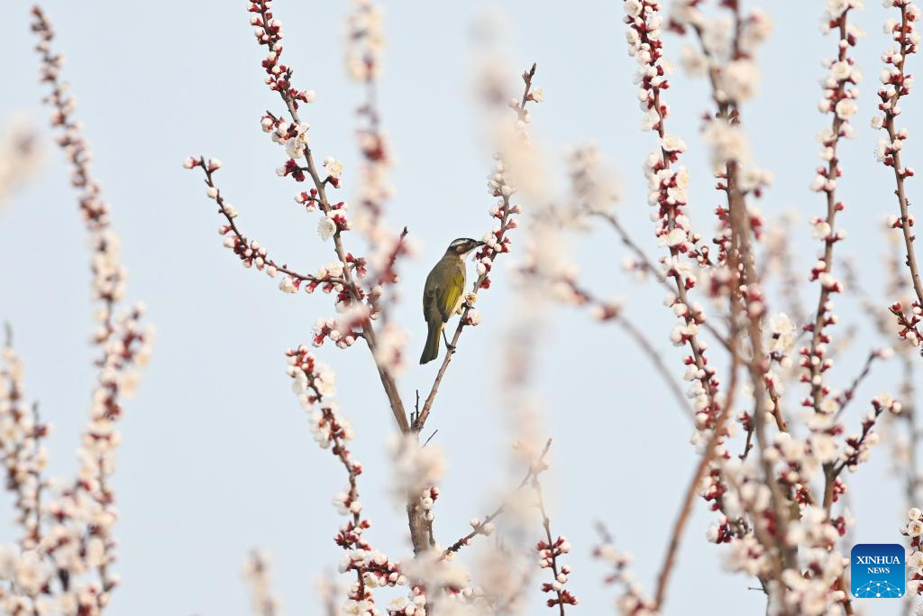 BEIJING, 12 marzo, 2026 (Xinhua) -- Un ave es vista entre flores en un parque, en el poblado de Xigang, en la ciudad de Tengzhou, en la provincia de Shandong, en el este de China, el 12 de marzo de 2026. (Xinhua/Li Zhijun)
