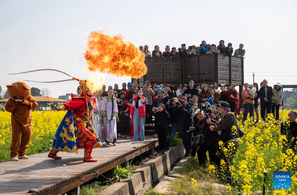 BEIJING, 12 marzo, 2026 (Xinhua) -- Imagen del 11 de marzo de 2026 de un artista de la Opera de Sichuan realizando una presentación para turistas en un campo de flores de colza, en el poblado de Jiuchi de la ciudad de Chengdu, en la provincia de Sichuan, en el suroeste de China. (Xinhua/Luo Guoyang)