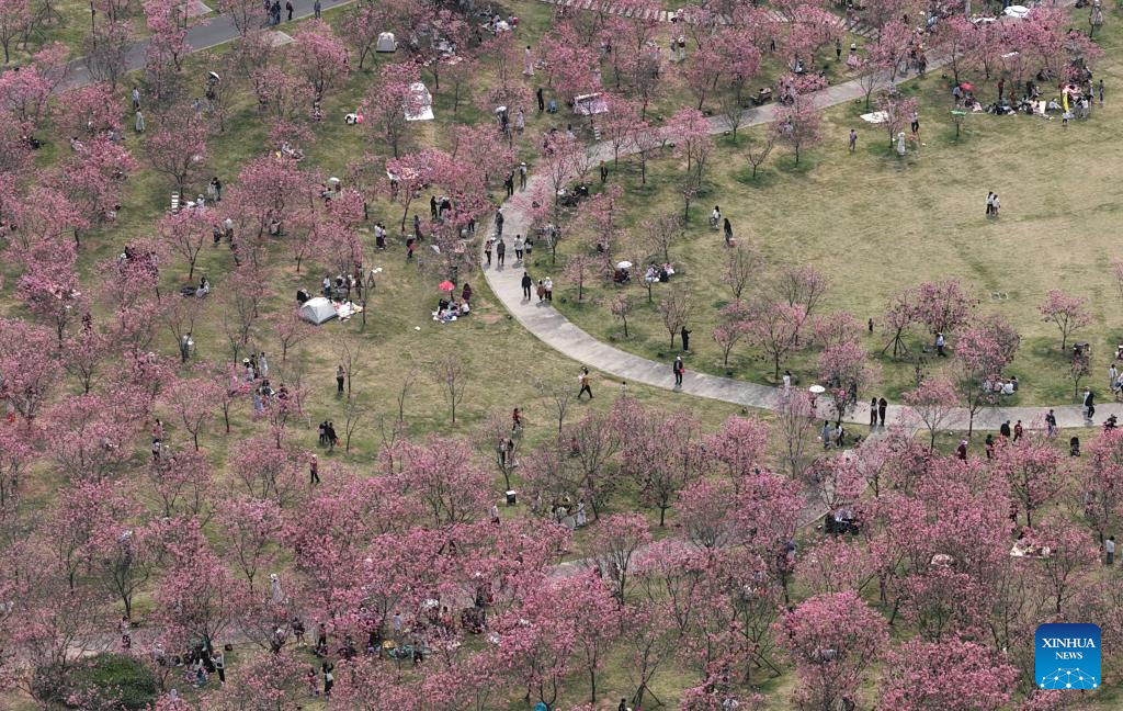 BEIJING, 14 marzo, 2026 (Xinhua) -- Vista aérea tomada con un dron el 14 de marzo de 2026 de personas observando flores en un parque, en Wuhan, en la provincia de Hubei, en el centro de China. (Xinhua/Xiao Yijiu)