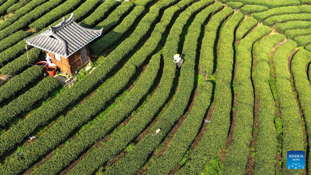 GUANGXI, 14 marzo, 2026 (Xinhua) -- Vista aérea tomada con un dron el 13 de marzo de 2026 de un agricultor recolectando hojas de té en un jardín de té, en el distrito autónomo dong de Sanjiang, en la región autónoma zhuang de Guangxi, en el sur de China. Mientras la temporada de recolección de té de primavera comienza, las fábricas de té y los agricultores se encuentran ocupados cosechando hojas de té, en el distrito autónomo dong de Sanjiang. (Xinhua/Zhang Ailin)