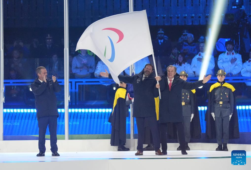 CORTINA D'AMPEZZO, 16 marzo, 2026 (Xinhua) -- Imagen del 15 de marzo de 2026 de la entrega de la bandera paralímpica durante la ceremonia de clausura de los Juegos Paralímpicos de Invierno Milán-Cortina 2026, en Cortina D'ampezzo, Italia. (Xinhua/Hou Jun)
