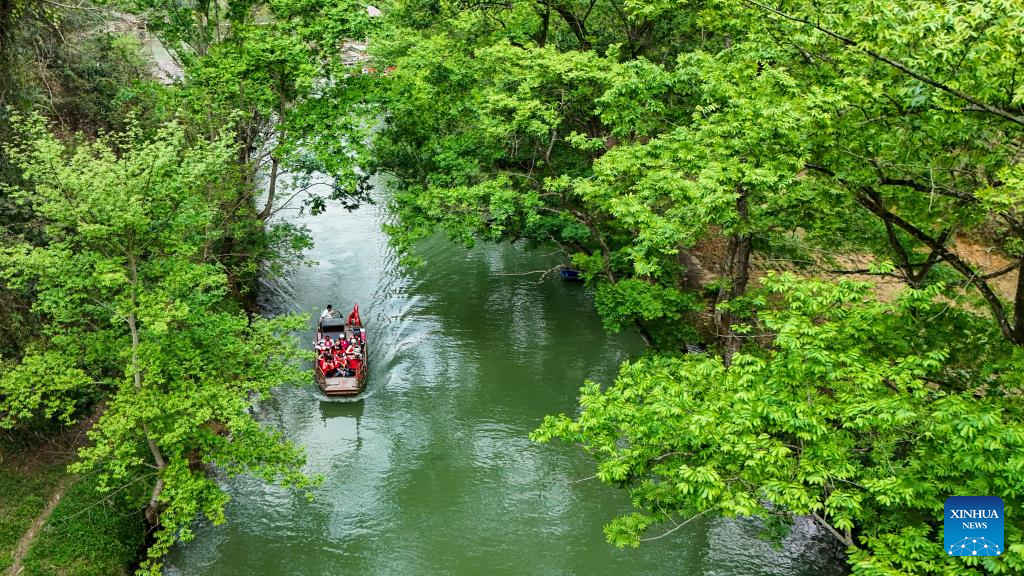 GUANGNAN, 18 marzo, 2026 (Xinhua) -- Imagen tomada con un dron el 17 de marzo de 2026 de turistas realizando un paseo en bote en un área escénica, en la aldea de Bamei del distrito de Guangnan, en la prefectura autónoma zhuang y miao de Wenshan, en la provincia de Yunnan, en el suroeste de China. (Xinhua/Peng Yikai)