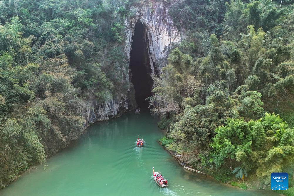 GUANGNAN, 18 marzo, 2026 (Xinhua) -- Imagen del 17 de marzo de 2026 de turistas entrando en una cueva en bote en un área escénica, en la aldea de Bamei del distrito de Guangnan, en la prefectura autónoma zhuang y miao de Wenshan, en la provincia de Yunnan, en el suroeste de China. (Xinhua/Peng Yikai)