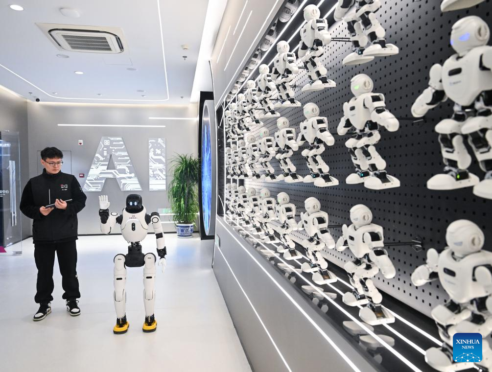 NANJING, 19 marzo, 2026 (Xinhua) -- Imagen del 4 de diciembre de 2025 de un robot humanoide saludando a las personas en un centro de distribución de inteligencia artificial, en Nanjing, en la provincia de Jiangsu, en el este de China. En los últimos años, la provincia de Jiangsu, en el este de China, ha priorizado la robótica incorporada como una industria clave para el futuro. (Xinhua/Ji Chunpeng)