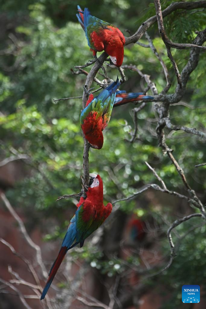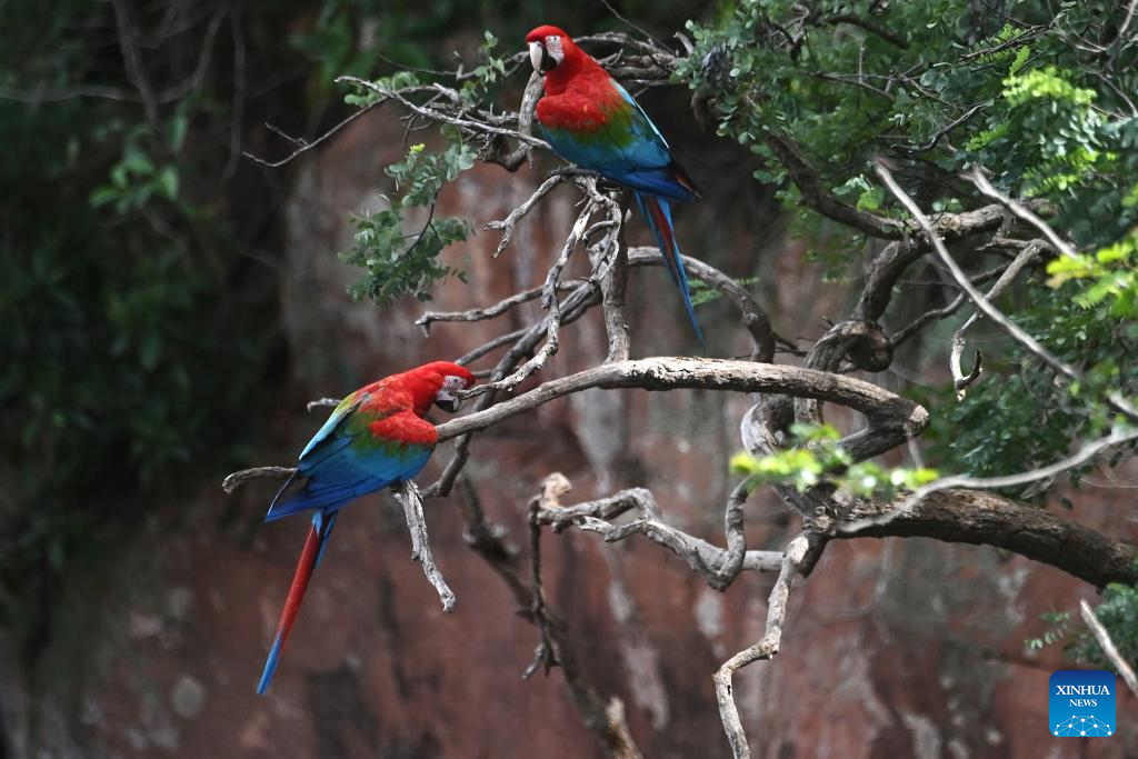 MATO GROSSO DO SUL, 19 marzo, 2026 -- Guacamayas bandera se posan sobre una rama en Buraco das Araras, en el municipio de Jardim, en el estado de Mato Grosso do Sul, Brasil, el 19 de marzo de 2026. (Xinhua/Lucio Tavora)