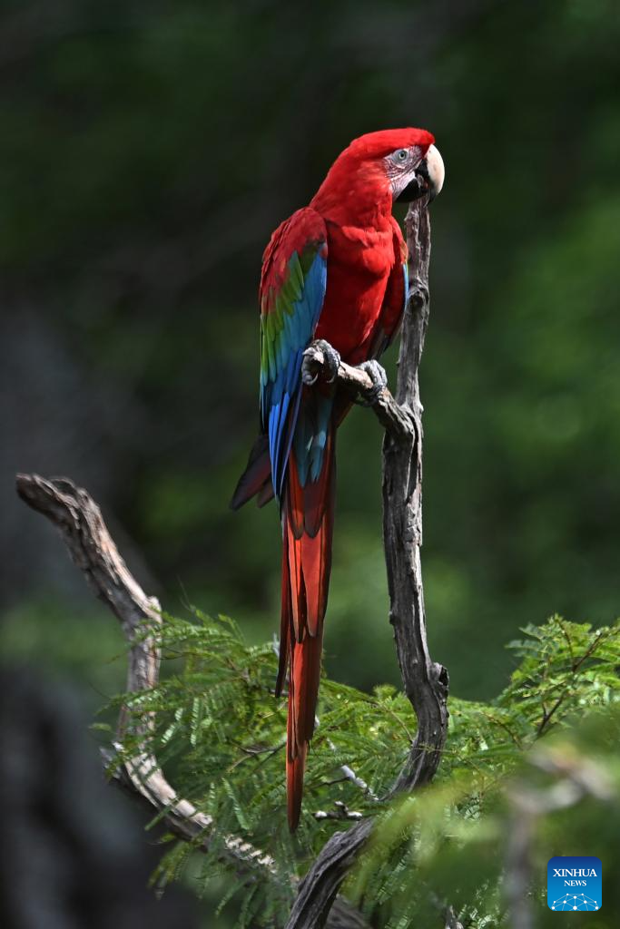 MATO GROSSO DO SUL, 19 marzo, 2026 -- Un guacamaya bandera se posa sobre una rama en Buraco das Araras, en el municipio de Jardim, en el estado de Mato Grosso do Sul, Brasil, el 19 de marzo de 2026. (Xinhua/Lucio Tavora)