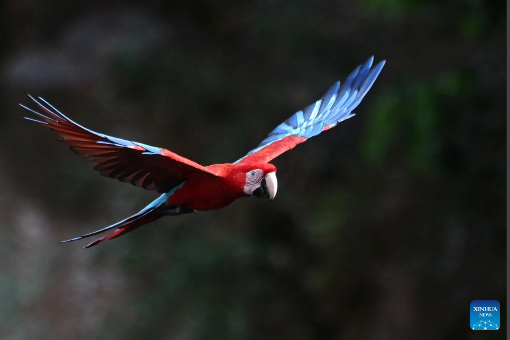 MATO GROSSO DO SUL, 19 marzo, 2026 -- Una guacamaya bandera vuela en Buraco das Araras, en el municipio de Jardim, en el estado de Mato Grosso do Sul, Brasil, el 19 de marzo de 2026. (Xinhua/Lucio Tavora)