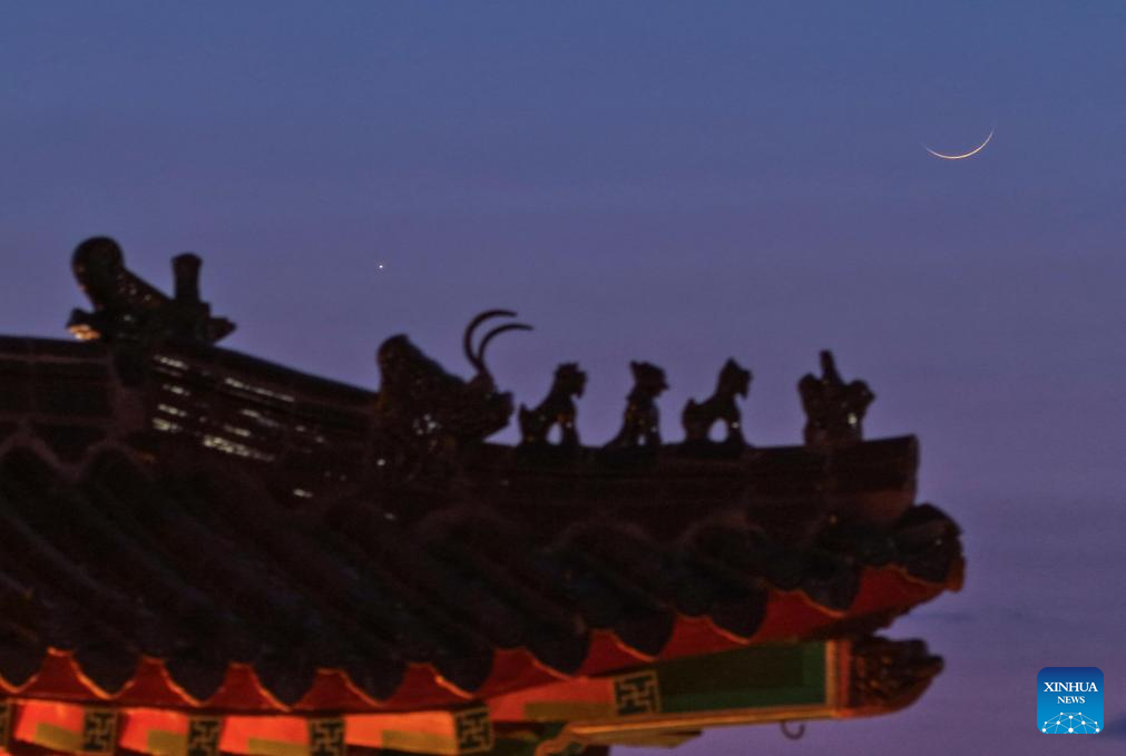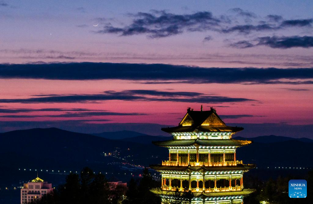 HARBIN, 20 marzo, 2026 (Xinhua) -- Imagen del 20 de marzo de 2026 del planeta Venus junto a la luna en el cielo crepuscular sobre la ciudad de Tongjiang, en la provincia de Heilongjiang, en el noreste de China. (Xinhua/Liu Wanping)
