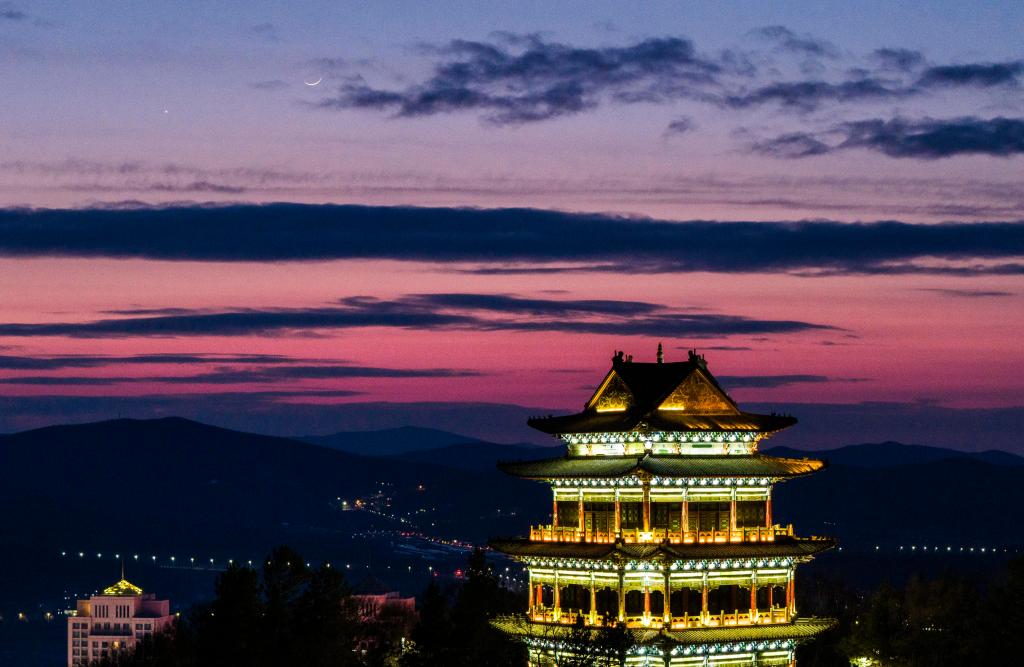 HARBIN, 20 marzo, 2026 (Xinhua) -- Imagen tomada con un dron el 20 de marzo de 2026 del planeta Venus junto a la luna en el cielo crepuscular sobre la ciudad de Shuangyashan, en la provincia de Heilongjiang, en el noreste de China. (Xinhua/Han Yang)