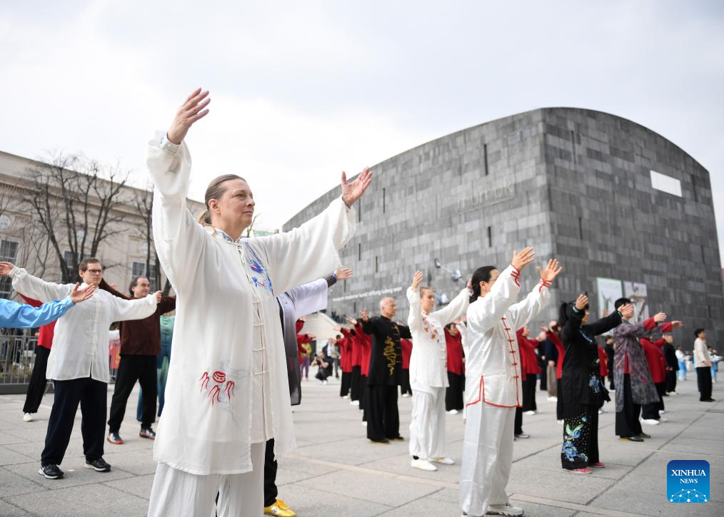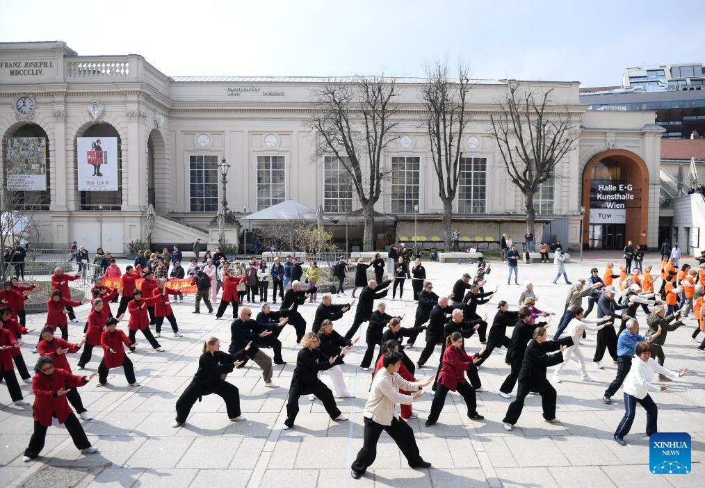 VIENA, 21 marzo, 2026 (Xinhua) -- Entusiastas realizan una presentación de Taijiquan, un tipo de arte marcial tradicional chino, en Viena, Austria, el 21 de marzo de 2026. Una celebración por el primer Día Internacional del Taijiquan se llevó a cabo aquí el sábado. (Xinhua/He Canling)