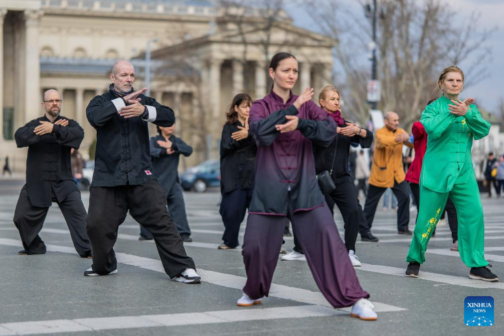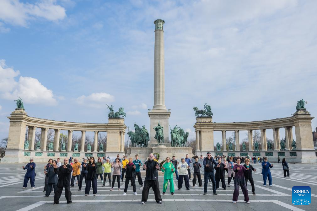 BUDAPEST, 21 marzo, 2026 (Xinhua) -- Entusiastas del Taijiquan realizan una presentación durante el evento de celebración, en Budapest, Hungría, el 21 de marzo de 2026. Una celebración por el primer Día Internacional del Taijiquan, organizada por la Federación Húngara de Wushu, se llevó a cabo aquí el sábado en la Plaza de los Héroes. (Xinhua/Marton Koncz)