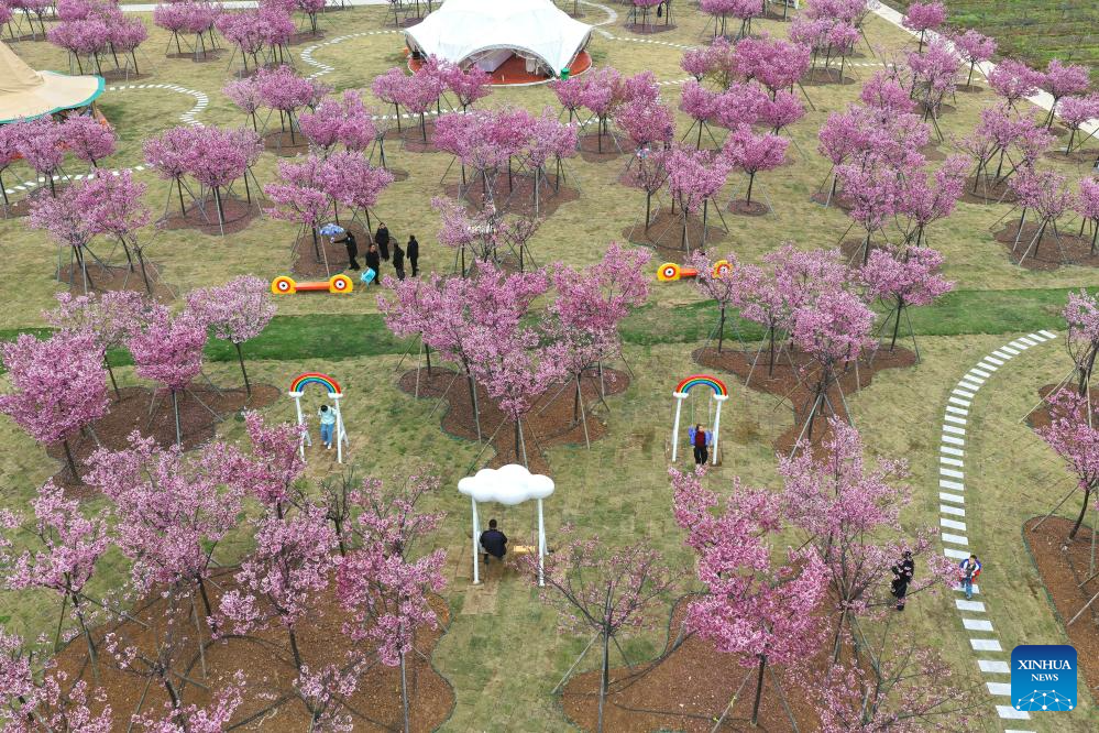 BEIJING, 22 marzo, 2026 (Xinhua) -- Vista aérea tomada con un dron del 21 de marzo de 2026 de personas disfrutando en medio de flores en un área escénica, en el poblado de Nanma de la ciudad de Dongyang, en la provincia de Zhejiang, en el este de China. Personas salen al aire libre y disfruta de la naturaleza mientras la primavera se extiende por toda China. (Xinhua/Bao Kangxuan)