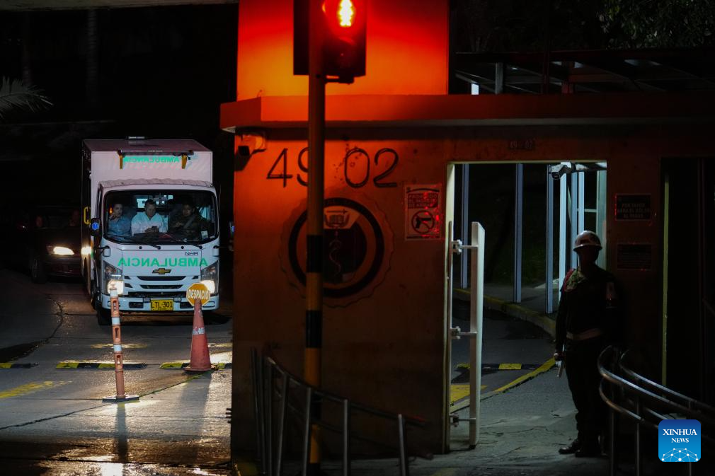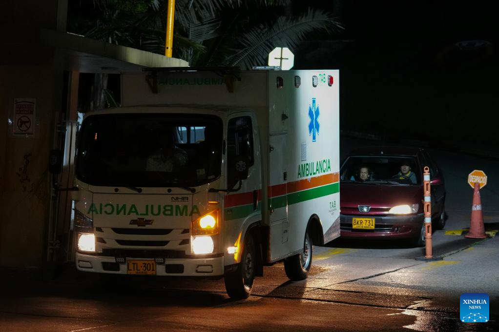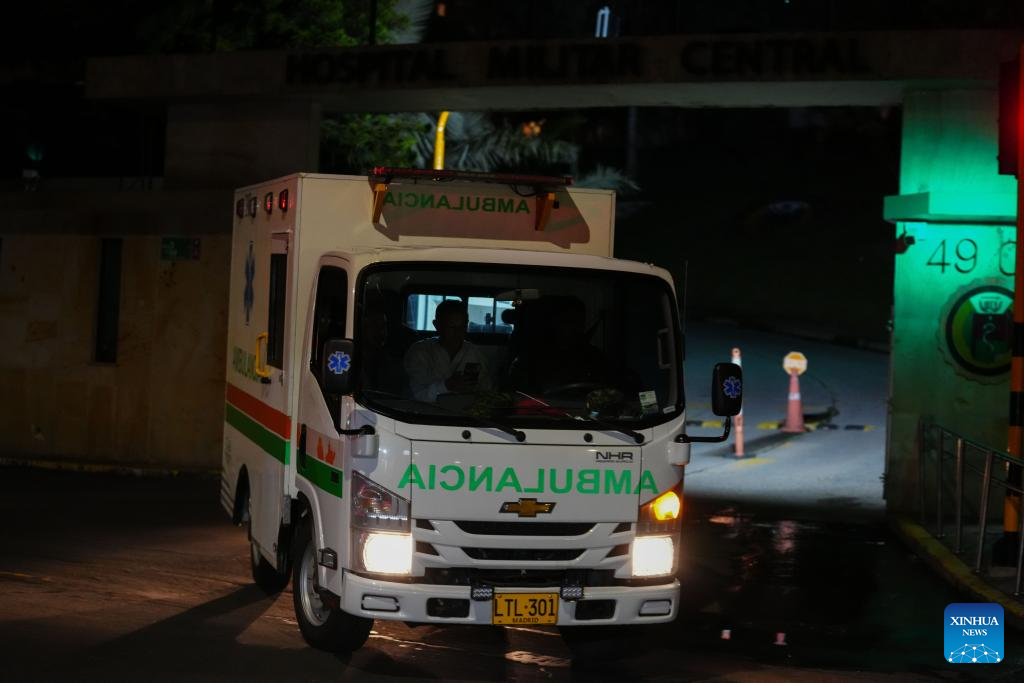 Una ambulancia sale del Hospital Militar Central luego de trasladar a heridos del accidente de un avión Hércules del Ejército Nacional colombiano, en la ciudad de Bogotá, capital de Colombia, el 23 de marzo de 2026. Ascendió a 66 el número de personas que perdieron la vida el lunes en el accidente de un avión Hércules del Ejército Nacional de Colombia, en el departamento de Putumayo, según la cadena colombiana Caracol Radio citando a fuentes oficiales. (Xinhua/Andrés Moreno)