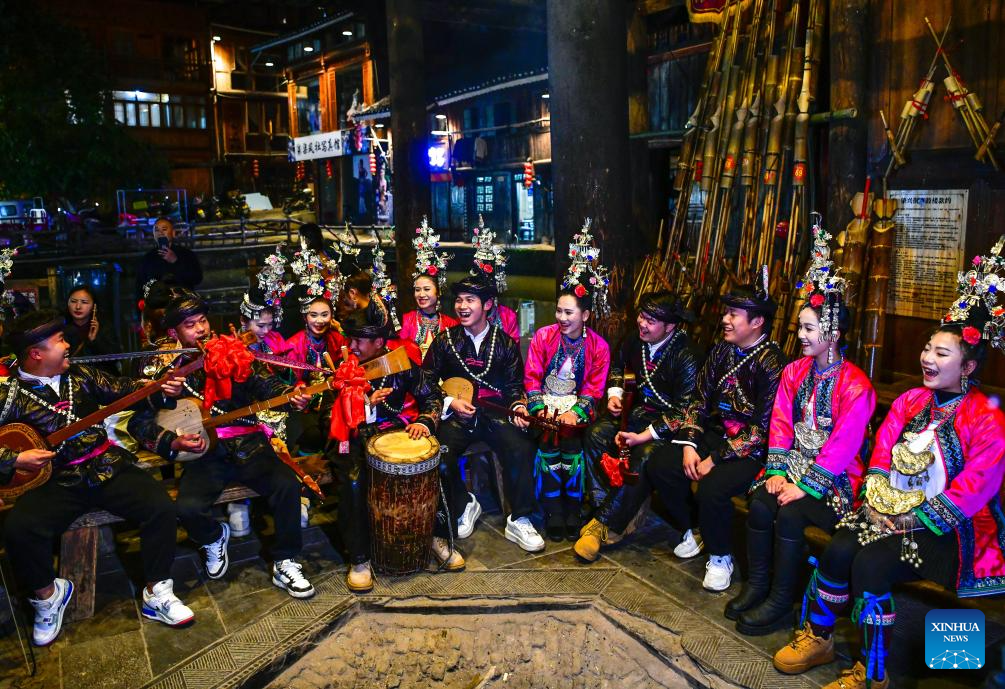 LIPING, 24 marzo, 2026 (Xinhua) -- Imagen del 23 de marzo de 2026 de residentes locales dando la bienvenida a los invitados, en la aldea dong de Zhaoxing, en el distrito de Liping, en la provincia de Guizhou, en el suroeste de China. El coro a capela The Whiffenpoofs de la Universidad de Yale visitó el distrito de Liping, en la provincia de Guizhou, en el suroeste de China, del 23 al 24 de marzo para participar en actividades de intercambio cultural. (Xinhua/Yang Wenbin)