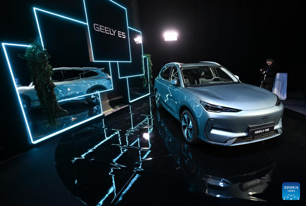 MADRID, 26 marzo, 2026 (Xinhua) -- Imagen del 25 de marzo de 2026 de personas observando un vehículo Geely, en Madrid, España. Geely Auto lanzó oficialmente dos SUVs eléctricas, la Starray EM-i y la Geely E5, en un evento en Madrid, España, el 25 de marzo. (Xinhua/Cheng Min)