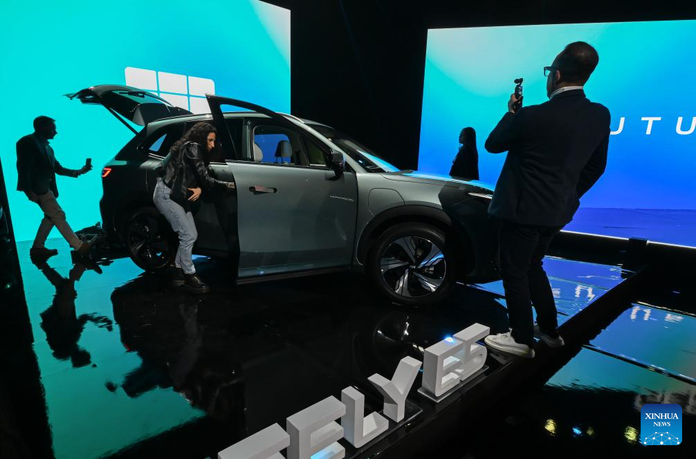 MADRID, 26 marzo, 2026 (Xinhua) -- Imagen del 25 de marzo de 2026 de un visitante observando un vehículo Geely, en Madrid, España. Geely Auto lanzó oficialmente dos SUVs eléctricas, la Starray EM-i y la Geely E5, en un evento en Madrid, España, el 25 de marzo. (Xinhua/Cheng Min)