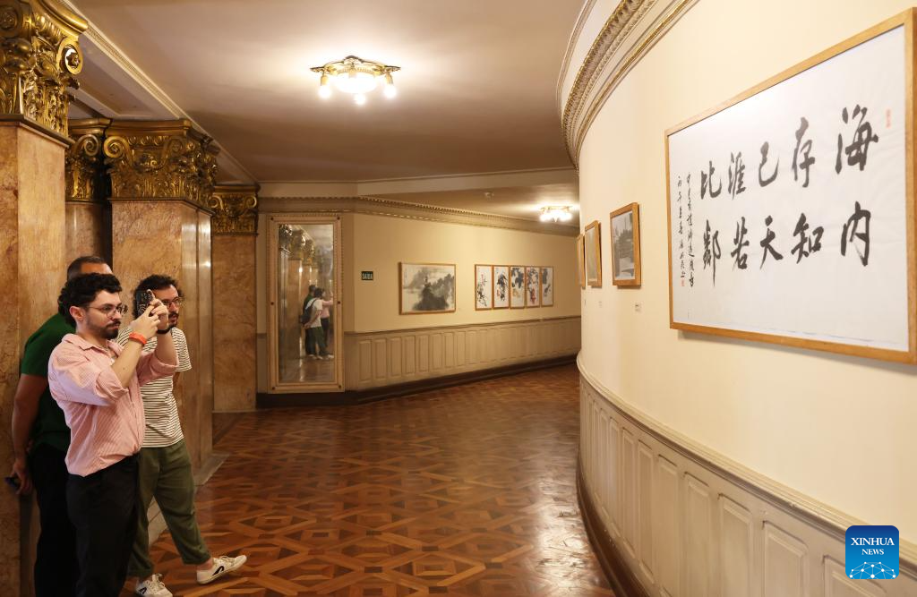 RIO DE JANEIRO, 26 marzo, 2026 (Xinhua) -- Imagen del 25 de marzo de 2026 de visitantes observando pinturas chinas en una exposición de caligrafía y pintura chino-brasileña en el Teatro Municipal de Río de Janeiro, Brasil. La exposición, titulada "Horizontes en Diálogo", fue inaugurada el miércoles en Río de Janeiro. (Xinhua/Jin Haoyuan)